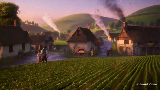 A quiet rural village awakens as the first light of dawn breaks over the horizon. The soft glow of the sun gently illuminates the rooftops of small stone cottages, casting long shadows across fields of golden wheat. Birds begin to chirp, and a thin mist lingers just above the ground.