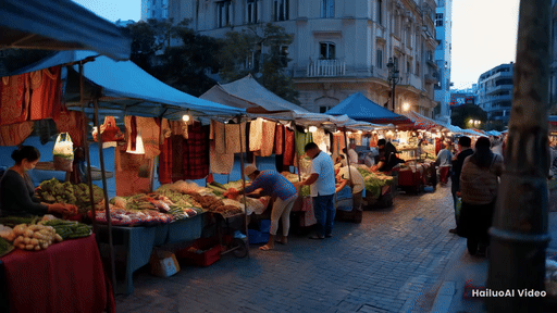 In the heart of a bustling city, a street market comes to life in the early hours of the morning. Vendors set up their stalls, displaying fresh produce, colourful fruits, vegetables, and local goods. The camera pans across the market, capturing the sounds of conversations.